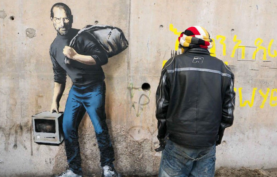 I za kraj jedan od poslednjih radova je na zidovima izbegličkog kampa u Francuskoj "The Son of a Migrant from Syria". Neki biografi tvrde da je Steve Jobs sin političkog migranta iz Sirije iz grada Homs koji je danas opustošen građanskim ratom.